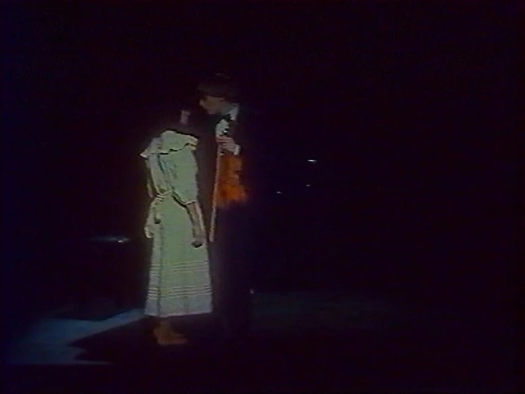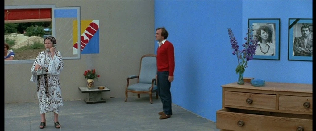 Ginette is haunted by her past — her experiences and memories are laid bare in front of the camera. These memories exist within the film’s present, in the same space, the same set, and the same field in which the rest of the film occurs. This device is framed by Ginette recounting her past to a radio call-in show. She is alone in the house, telling the host over the phone how she and her husband Richard (Jean-Christophe Bouvet) drifted apart years ago. Bouvet emerges from behind the stage’s red curtain. The memory of Richard walks around her in her home, kissing her and screaming at her. Bouvet walks out of frame to change into a red sweater. It’s the same sweater he wears in the next scene, a flashback to their breakup. Separated by a few meters and a 90° leftward pan from where Ginette was just standing the phone, she and her children wear monochrome outfits, the same shade of red as Bouvet, a shade also shared in this scene by the curtains and letters spelling ‘RIC[H]ARD’ on a poster. Vecchiali stages Ginette’s memory, like the breakup, between her own recollections over the phone in the present. Delsaux and Bouvet wear yellow in the scene where they meet, white on a picnic, and blue when they embrace over the tragedy of their stillborn child. ‘Color obeys a principle of organization of emotional themes complex enough to not seem to belong to any one of the film’s perspectives,’ [1] Jean-Claude Biette says of the film. The stage is constructed from the colors of her memory. Ginette’s home is littered with objects in these colors: flowers, cups, furniture, picture frames — inanimate signifiers of her past, memories that stand still on a stage of her creation.