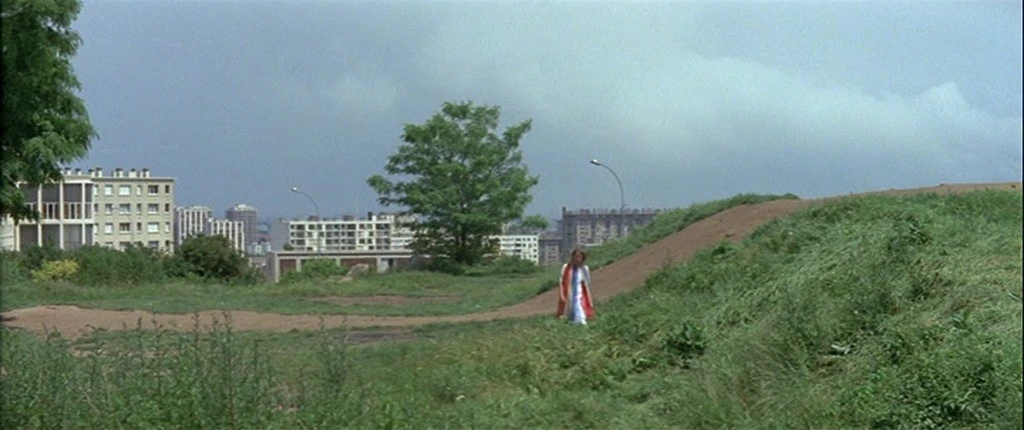 In the film’s first shot, an unnamed woman (Nathalie Cercuel) walks over a hill and towards the camera in the direction of the stage. Her scarf bears the tricolor — red, yellow, and blue — of Ginette’s experiences, flowing in whatever direction the wind wills; this spectress of memory haunts the film and Ginette. In her next appearance, Cercuel is seen through the window of Ginette’s stage-home. She plays with Ginette’s children on the grass and holds a red telephone at the same time as Ginette is speaking on the phone herself. The next time this doubling appears is through the window once again, when Ginette opens the blinds and Cercuel can be seen on her knees, pleading before a woman in black; at the same time, Ginette pleads with her own woman in black: her friend Simone Barbès, the porn theatre usher in Marie-Claude Treilhou’s film. Simone is an intervention in the film — for black is the absence of color — just as Michel Delahaye, the cop, who is also in black, is the one who covers Ginette when she is on the ground nude, wailing, throwing away everything on the grass outside: her clothes and her given name, Solange Tartan-Jacket, who she will no longer be. As the wind forces the blinds back down, Simone and Ginette step outside the stage. ‘The problem is, reality scares everyone’, Simone tells her friend, who urges her to forget about Richard and find a new love. Then Cercuel walks into frame and watches Ginette from the background; a triangle forms between the three women, with Ginette between the two points. The presence of these women causes a dilemma between reality and memory. Ginette doesn’t look at her double — she walks towards Simone, towards the camera and out of frame into a two shot of her and Simone. She retreats from Cercuel and does not look back at her, going back inside with Simone. Ginette cannot bear to face her past. She withdraws to the stage she has built from her memories but cannot contend with her memories as embodied in Cercuel. She takes Simone’s advice to find a new lover but still cannot face herself.