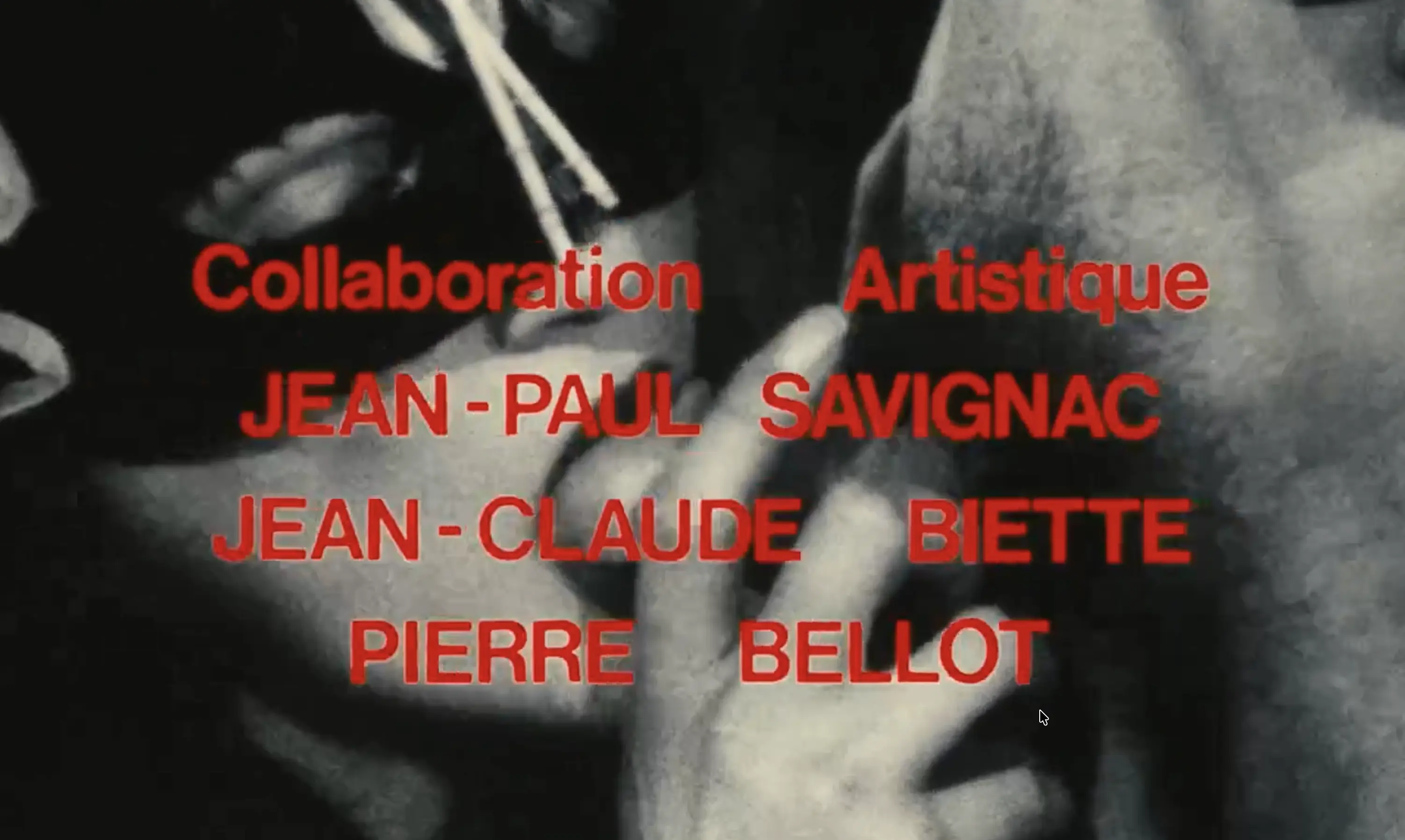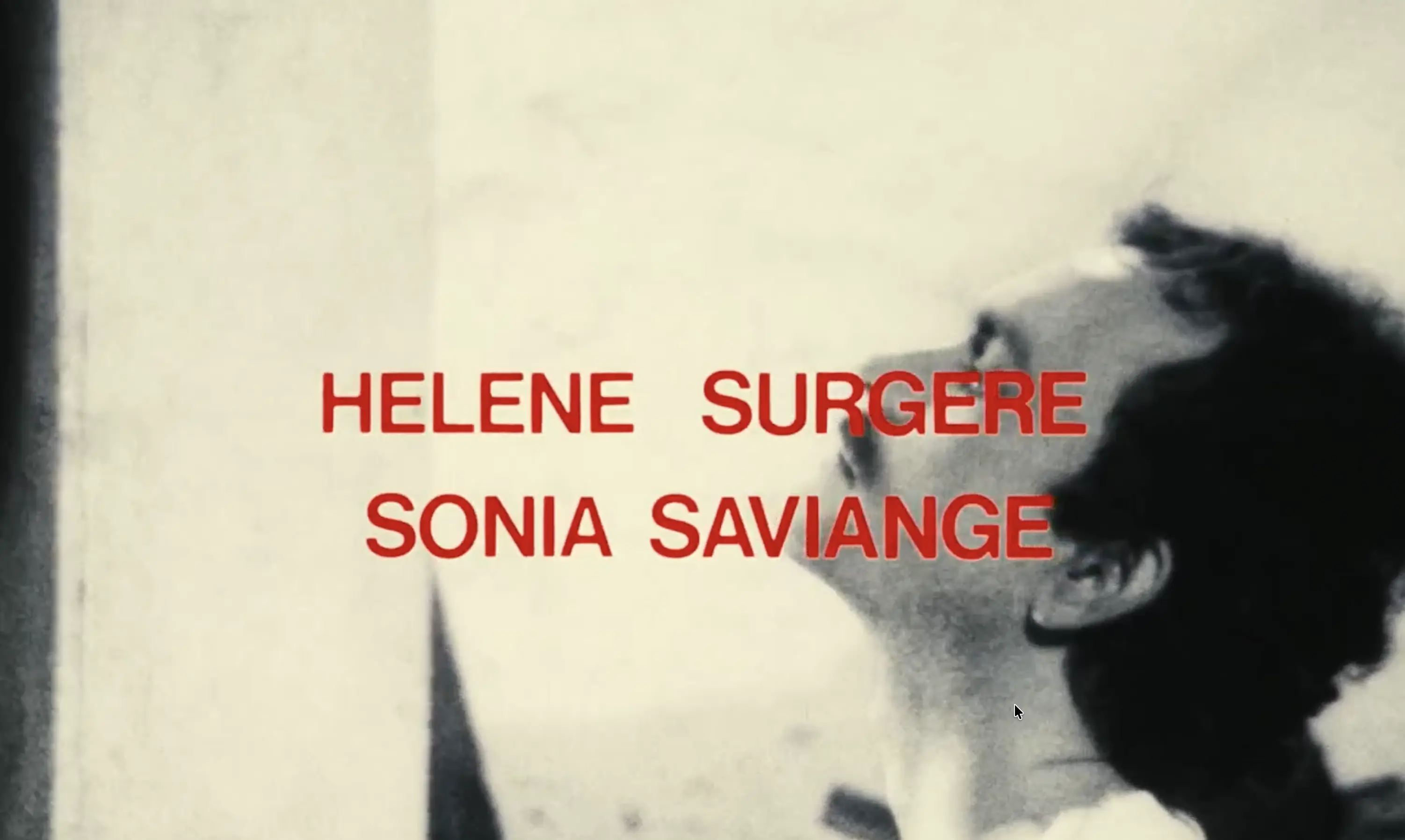 It would be easy to arrange, out of the first few minutes of Change pas de main, one of the litanies of binary oppositions dear to academic film studies. The white of a gloved hand pulling a trigger, the red of the blood pouring out of the bullet wound. Faceless bodies and limbs, then a close-up of an anxious Hélène Surgère. The 35mm color stock of the film proper against the rough grain of the 16mm black and white film within the film. The profile of a mustachioed Jean-Christophe Bouvet, flipped to its mirror image in the next shot. Man/woman; body/head… even Roland Vincent’s score, which seems to be two pieces of music discordantly superimposed. And above all, the title itself, or rather the film’s two titles, since the title card shows the letters DE and MAIN thrusting towards each other, giving us, in alternation, Change pas de main (Don’t Change Hands) and Change pas demain (Don’t Change Tomorrow).