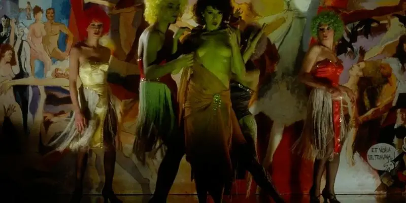 Vecchiali inherited from his hero Jean Grémillon a keen sense for the fragility and decay of things, which always inhabits the underside of his films’ overwhelming effect of red-blooded human presence. When, at the start of the second reel, we see the black and white photographs that gumshoe Mélinda’s partner Natacha has taken in the club, we’re also seeing the first reel as something already passed into the fixity of recorded images — frozen poses, an obituary for a scene. Change pas de main is full of photographs and film reels: well before Godard enters his melancholic-reflective mode, Vecchiali is already conflating the manifold processes of social entropy — the darkening of time — with the aging of images and the distortion of real events by permanent photochemical capture. That distortion seeps into reality itself and causes acts and their representations (visual, narrative, mental, sociological) to fold endlessly in on each other, a process Derrida (born three months after Vecchiali) would, interestingly, soon term invagination. [6] This is a kind of minor key cinephilia, manifested elsewhere in the naming of the seedy club at which Victor/Marcel’s murder takes place ‘Shanghai Lily’s’, and its decoration with a huge photograph of Marlene Dietrich. Here, cinephilia is transformed from a source of detournements, provocations and boyish homages — as it generally functioned in the films of the Nouvelle Vague — into a set of axioms or premises for far more troubled elaborations. And if it matters that the murder is timed to the end of a song and dance number, it’s because in this case another inheritance from earlier French cinema — the paradigm of life as performance, what we call in English the ‘All the world’s a stage’ topos — has been recast in a similar register. [7] So when Mélinda and Natacha, sitting below a clothes line on which some of the latter’s photographs are drying, and reeling from the violence they have just witnessed, melt into a ménage à trois with their companion Andrew, we might ask whether this is a release of tension or another act of obedience to heteronomic choreography. Vecchiali knows that we know that this scene fulfills part of the film’s pornographic quota. ‘Feeling better?’, asks Natacha. ‘Absolutely’, Mélinda replies. Natacha: ‘I love you.’ Vecchiali is constantly making a stereogram out of two flat images.