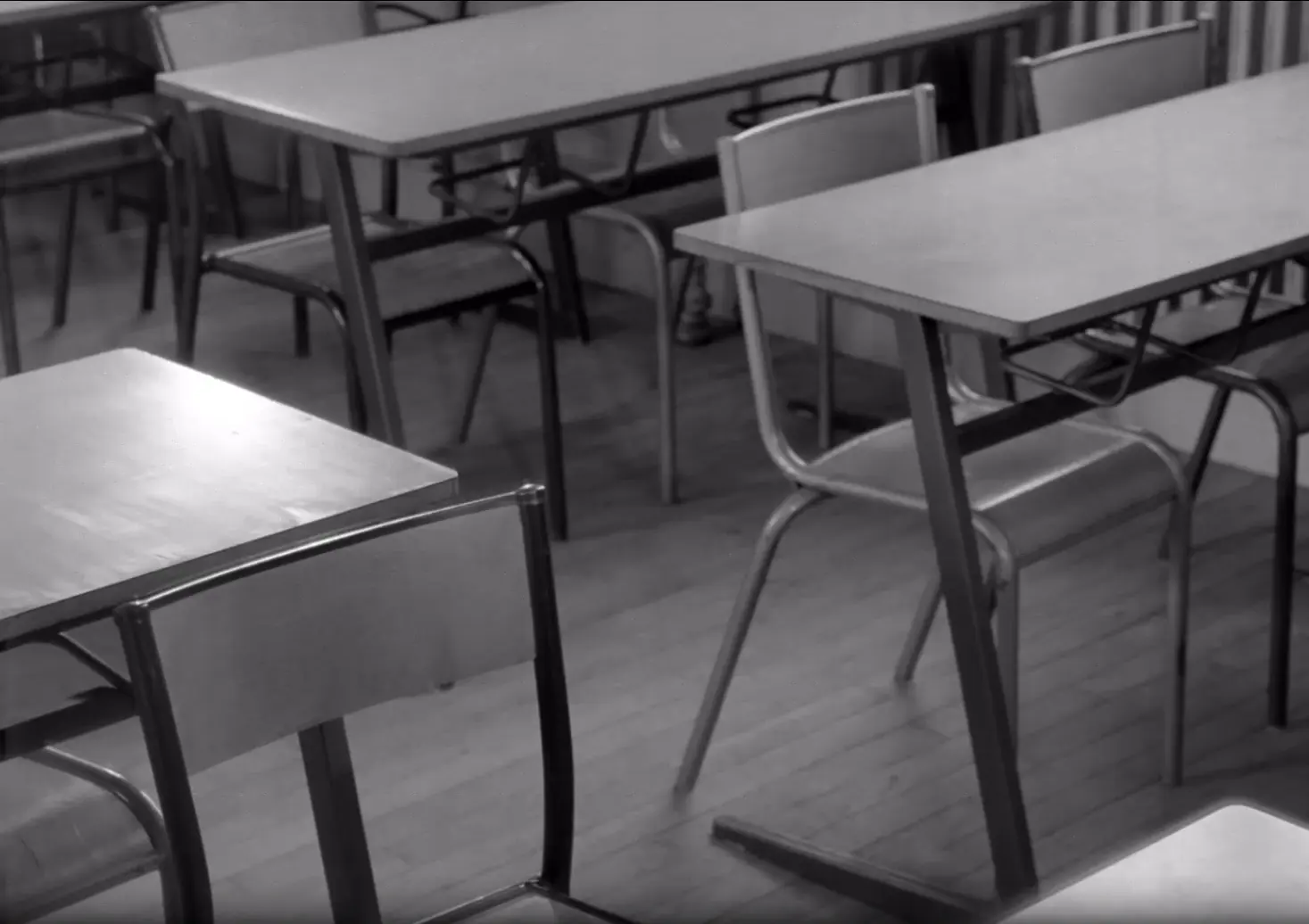 The following shot introduces Ernesto’s teacher at a door to the school, his body posturally superimposed on that of the father (neither will get further than this quizzical attitude), and the remainder of the film unfolds inside a classroom, where Ernesto is interviewed by the teacher in the company of his parents. The camera is placed here according to Huillet and Straub’s signature gesture: in one spot from which all the shots of the given space will be taken. Changes in lenses allow re-framings along the same axis, and like in Moses and Aaron, the height of the camera also shifts (but not inhumanly this time). One influential object remains outside of the frame: the teacher’s desk sits on a raised platform such as these classrooms used to have; its presence is felt only in the sound and the drop in height of the teacher as he steps off it, and perhaps also in the last, high angle from which we see Ernesto, which appears just before the teacher stands up behind his desk, and corresponds to the two characters’ increasingly frontal antagonism (the interposed surface of the empty desk is itself shot on the filmmakers’ preferred diagonal, and would reappear as such in the scene in Class Relations in which Karl Rossmann is sent away by his uncle). Ernesto’s departure towards the end of the film, by removing one of the two poles of this relationship, causes this angle to dramatically vanish: the tension literally leaves the frame like air from a balloon, and the remainder of the scene is shot on a low angle from the camera’s initial, lower height, so that, as the parents stand up from the school desks where they have been sitting with the other ex-student, we look up at them from the height of Ernesto’s ‘ghost’.